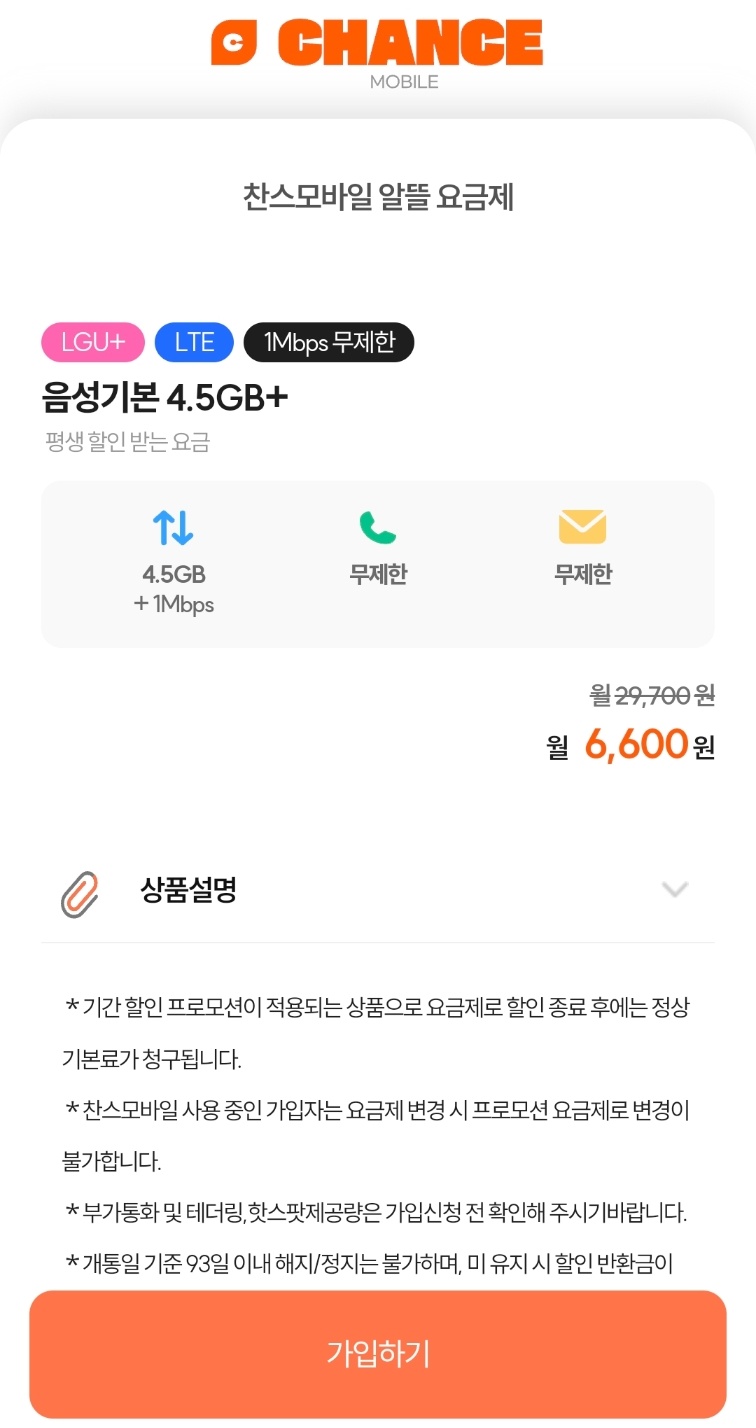 알뜰요금제) 엘지망 4.5GB+1Mbps 통화문자 무제한 평생 월6,600원